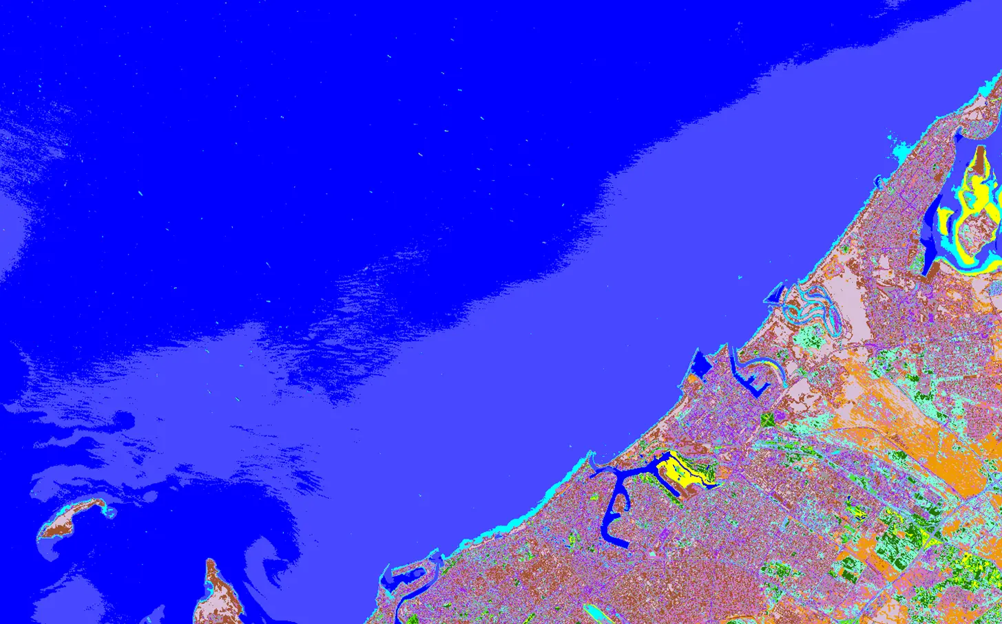 基于光谱特征库的智能分类算法,突破传统地物大类识别的局限。图为高光谱遥感器获取的迪拜沿海地区高光谱数据,通过地物分类可准确的识别出水体、建筑、道路、裸土等地物大类信息,并可在每一个大类中细分3~5类有效亚类,还能识别出远海的船只信息。