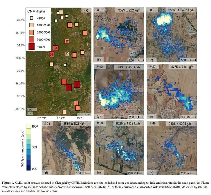 基于气体吸收光谱特征,建立温室气体精准监测网络。利用高光谱遥感数据,采用甲烷排放的新型反演算法,开展甲烷点源排放遥感监测。图为 GF5B 在长治探测到的甲烷泄漏监测结果,可以准确的监测到区域内清晰的甲烷排放羽流。