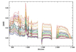 采用包络线去除的方法实现光谱反射率的归一化,是一种比较常见、有效的光谱特征增强处理方法。将光谱反射率归一化为 0 到 1,光谱的吸收特征也归一化到一致的光谱背景上,有利于与其他光谱曲线进行特征数值的比较,从而提取特征波段以供分类识别。
