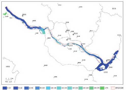基于 B35-B38-B40 三波段最优模型,对闽江流域福州段进行资源一号 02D 高光谱影像叶绿素 a浓度反演,得到叶绿素 a 浓度分布图(图 3),其总体上呈现低 - 高 - 低的特点:金水湖上游叶绿素 a 含量最低,小于 30 μg/L,水质较好;金水湖中游叶绿素a出现异常高值,但由于汇入闽江的小目溪水面窄且浅,参照历年卫星影像,此溪经常处于断流或半断流的状态,对闽江水质影响不大,仅提高20 μg/L左右;金水湖下游随着居民区增多,叶绿素a浓度逐渐升高,至荆溪段,由于荆溪的富营养化,溪流的汇入导致闽江叶绿素a浓度发生剧烈变化,但因不远处即为闽江分汊口,主航道变为乌龙江,流速呈南快北慢的特点,异常的叶绿素 a随水流南移,对闽江北港的影响有限;分汊口至洪山大桥段,水质较为稳定,浓度为50~100 μg/L。 其后突然升高,水面可见较多的白色泡沫,浓度在100 ~ 200 μg/L,多数超过 150 μg/L,持续到尤溪洲大桥附近,长约为 5 km。且在 2021 年 1 月 25日影像图上,仍可见泡沫,说明此问题在较长时间一直存在,但未见明显汇入水系或排污口,该地处于西区水厂取水口附近,亦是水源保护区,应当引起重视;过尤溪洲大桥后,叶绿素 a 浓度一直呈下降趋势,至马尾段叶绿素 a 浓度降至 30 μg/L 以下;从反演结果来看,福州最大的内河——晋安河的汇入对闽江北港水质没有造成负担,且叶绿素 a浓度要远低于闽江北港。