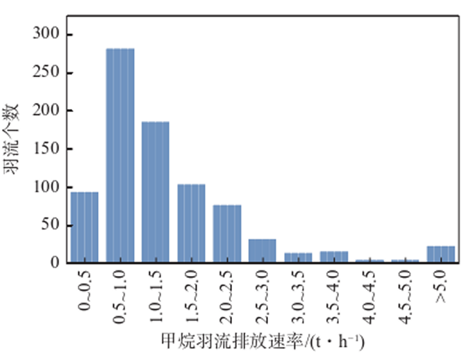 笔者以山西省煤炭行业的甲烷点源排放为研究 对象,利用GF5B–AHSI卫星数据,探测到山西省408 个煤炭行业厂矿的838个甲烷羽流。由于AHSI 具有30 m的空间分辨率,我们可以清晰地识别出单 个甲烷羽流的影像,并将其与具体的排放设施对应。 图2为甲烷羽流的排放速率大小的分布情况,整体呈 现偏态分布,大部分羽流的排放速率在0.5~1.5 t/h, 最小的排放速率为0.11±0.03 t/h,最大的排放速率为 10.82±4.27 t/h。大约84%的羽流的排放速率落在 0.5~3.0 t/h内,只有约8%的羽流的排放速率超过 3.0 t/h,这表明极高的甲烷排放通量往往来自于少数 点源的异常排放。这与IRAKULIS-LOITXATE等。