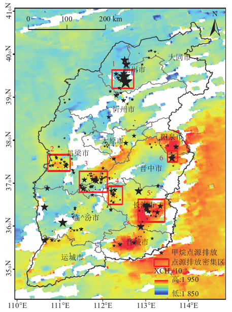 图3显示了山西省煤炭行业甲烷点源排放的空 间分布,底图是TROPOMI在2021年10月—2023 年3月(本研究使用AHSI数据的时间范围)观测反 演的山西省甲烷柱浓度产品XCH4的平均值。图2 中的黑色五角星代表不同企业的点源位置,五角星大 小反映排放通量大小。图2用红色方框标出了6个 点源密集区域,并进行了编号。由图2可以看出,山 西省东南部的XCH4明显高于其他地区,主要集中在 阳泉市、长治市和晋城市。其中5号密集区和6号密 集区分别对应阳泉市和长治市两个XCH4高值区, 2号、3号和4号密集区的XCH4也较高,这些甲烷点 源密集区域与XCH4数据相互印证了其合理性。