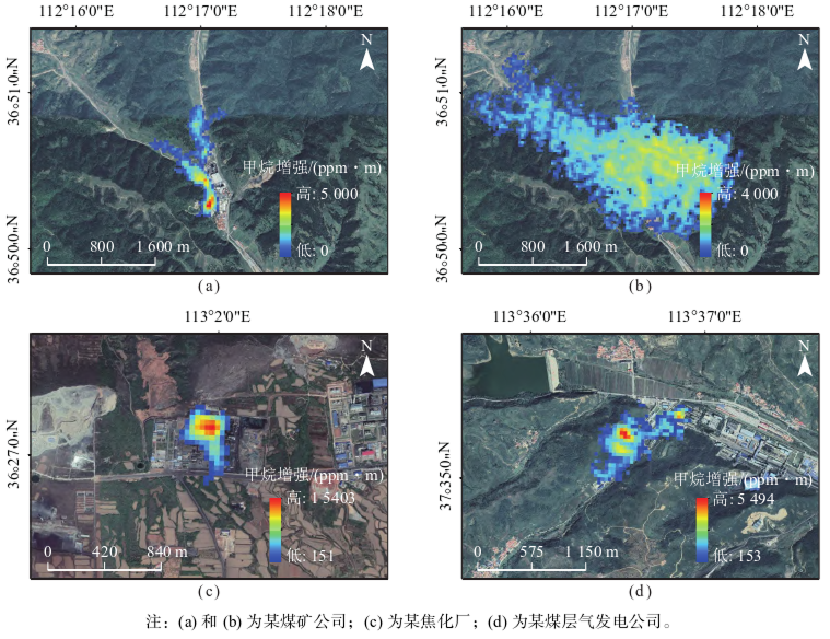 图3为山西省煤炭行业的几个典型甲烷排放源 的羽流图像。图3(a)、(b)为同一个煤矿(长治市某煤 业公司)在不同日期的羽流情况,可以看出它们的排 放强度和羽流扩散面积有明显差异,排放速率分别为 3.20±1.13 t/h和5.92±1.88 t/h,说明同一排放源的甲烷 排放速率会随时间变化而波动,有时甚至相差很大。 图3(c)、(d)为一个焦化厂和一个煤层气发电厂的甲 烷羽流情况,排放速率分别为1.91±0.16 t/h和2.67± 0.96 t/h,说明煤炭行业的上下游企业都可能是甲烷的 重要排放源,不仅仅是煤炭开采过程。