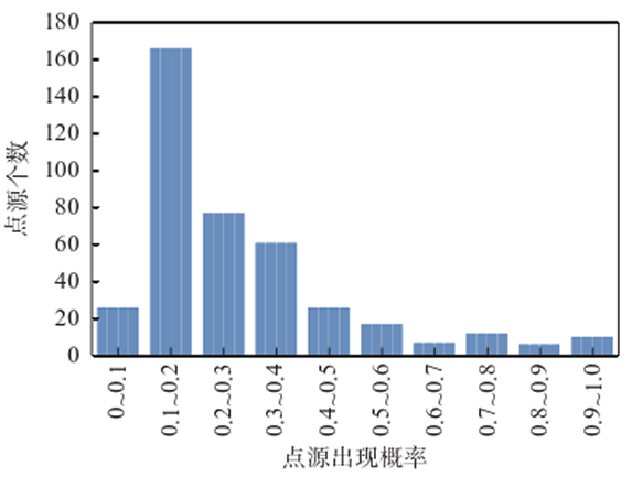 图4为每个排放源的排放概率Fi,它们是由羽流 出现次数除以检测次数计算得到。排放概率主要分 布在0.1~0.4,所有排放源的平均排放概率约为0.29。 将排放源按照排放概率的高低分为高度持续性(0.5 < Fi≤1)和高度间断性(0 < Fi≤0.25)两类,有助于分析 不同部门的排放特征,并为甲烷减排提供参考。高度 间断性的排放源可能与生产工艺或维护的不规律有关,它们占所有排放源的59%,但只贡献了全区域 排放速率的25%。相反,高度持续性的排放源只占所有排放源的13%,却贡献了全区域排放速率的41%, 它们可能源于工厂的连续排放或设施的故障。高度 持续性的排放源虽然数量较少,但对整个区域的甲烷 排放影响更大,因此优先识别并治理这些相对持久的 排放源,可能会显著降低甲烷排放。