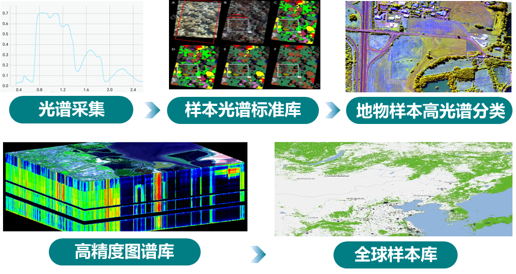 通过多源多尺度大数据同化融合等技术手段,构建各类地物波谱库、典型地块样本库、典型区域数据库,建立光谱数字地球。