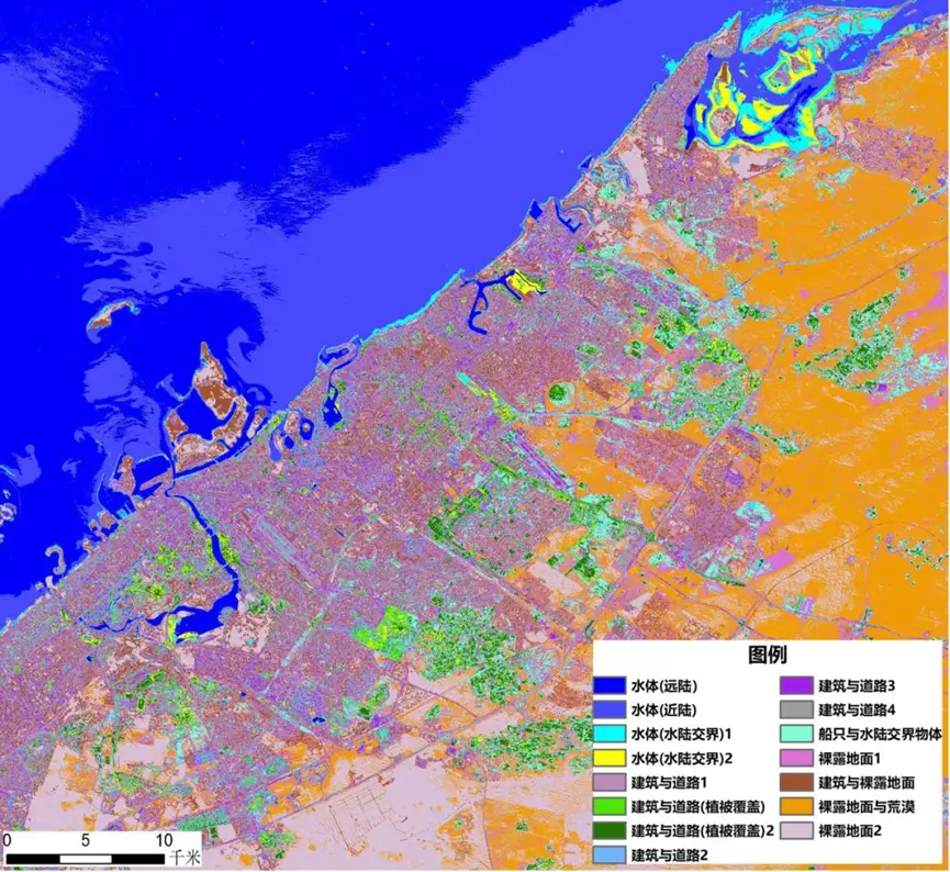 基于光谱特征库的智能分类算法,突破传统地物大类识别的局限。图为高光谱遥感器获取的迪拜沿海地区高光谱数据,通过地物分类可准确的识别出水体、建筑、道路、裸土等地物大类信息,并可在每一个大类中细分3~5类有效亚类,还能识别出远海的船只信息。