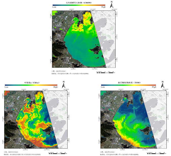 精准区分水华/水草光谱特征差异,同步反演叶绿素a(Chl-a)、悬浮物(TSM)、有色溶解有机物(CDOM)。图为星载高光谱遥感器获取的太湖区域水体环境图,可以明显识别水体内有色溶解性有机物、叶绿素a、悬浮物浓度等。